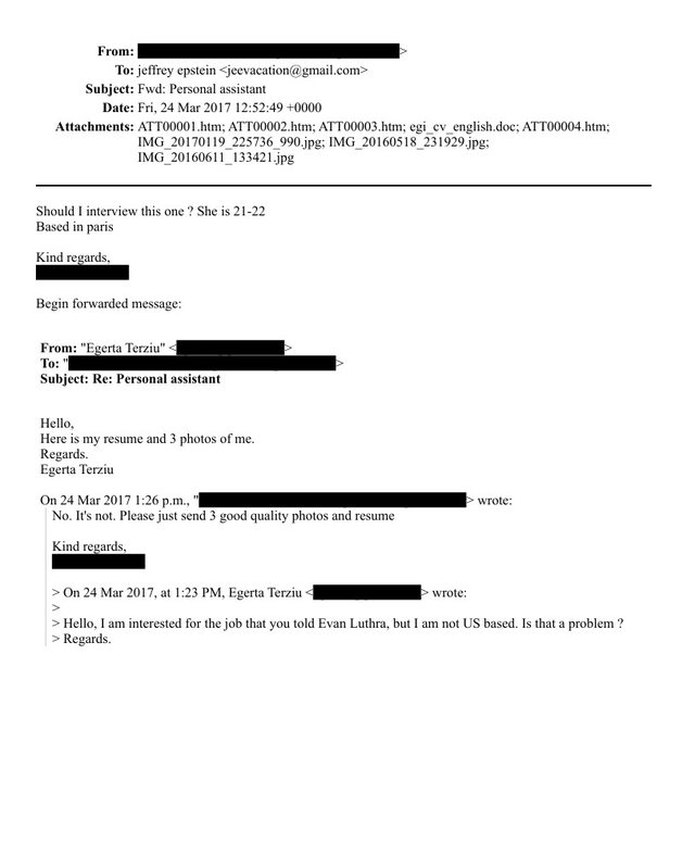 Dokumentet tregojnë se Terziu i ka dërguar fotot, dhe më pas është kontaktuar Jeffrey Epstein. Në komunikimin e mëvonshëm thuhet se vajza ishte 21–22 vjeç, jetonte në Paris, ndërkohë që në CV rezultonte se ndodhej në Tiranë. Përveç CV-së dhe fotove, në listën e bashkëngjitjeve rezulton se ajo ka dërguar edhe një video aplikimi.